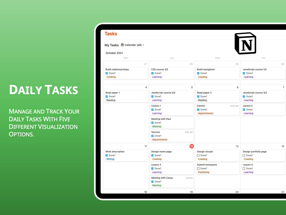 In need of a complete and automated workspace that helps you organize your life? My Personal Workspace is what you are looking for. The full integration among pages and databases with multiple view options will make it very easy for you to manage projects, set daily tasks, keep track of meetings, follow a daily routine, and much more.