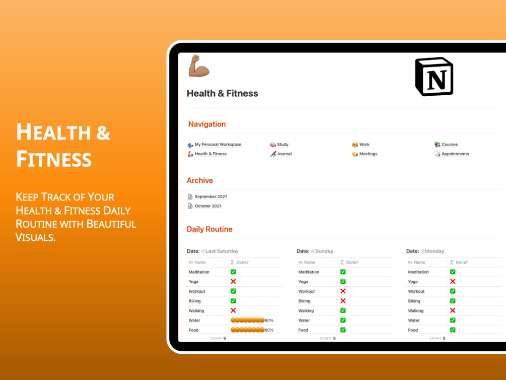Create a daily routine with one click, add the current date and track your activities during the day with the extra columns. Simply drag it to Health & Fitness at the end of the day to keep track of your progress during the year.